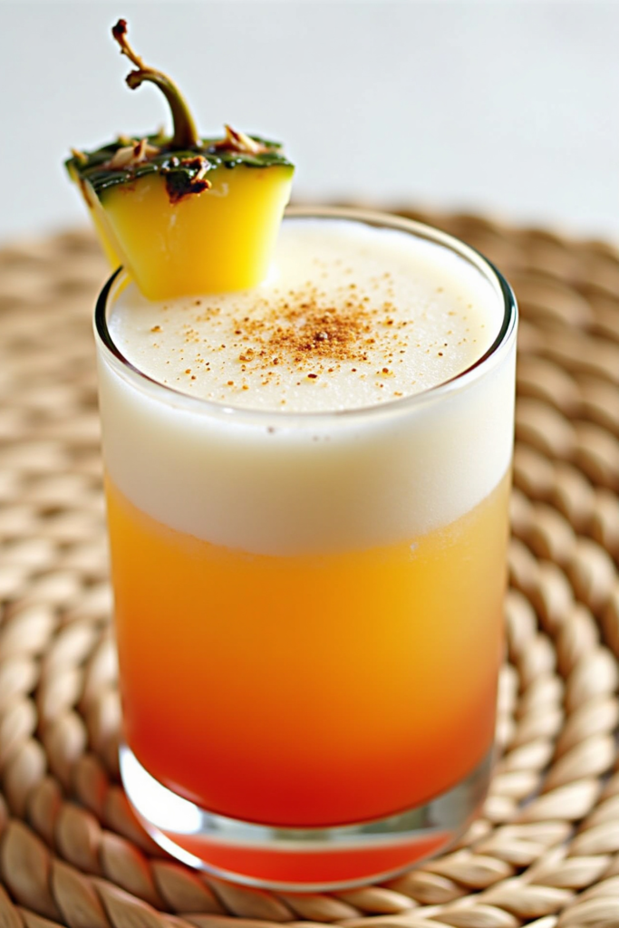 - Garnish generously with freshly grated nutmeg. Add a pineapple wedge and orange slice for a festive touch, if desired.